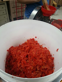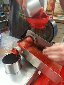 Now that the tomatoes are soft, washed and cut they can be minced. We scoop out some tomatoes and put them in the mincer. The mincer will separate the tomato sauce from the skin and the seeds. We generally fill one tub at a time.