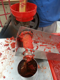 Once you have a (mostly) full tub of sauce, we actually put the left over skin and seed back through one more time and mix it with the rest of the sauce in the tub. This produces a thicker consistency and really gets the most out of the tomatoes. Be sure to mix the tub up well, otherwise the consistency will not be evenly spread.