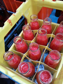 After the water has gone cold, the bottles can be pulled out and put away. We try to make enough to last us a whole year, so we put them into crates, keep one crate in the kitchen and store the rest of them in a cool place.