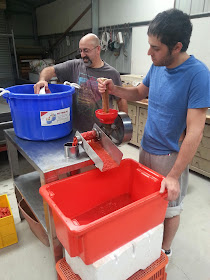 "Sauce tomatoes" are normally very ripe and soft, but sometimes they are quite firm. If this is the case they won't go through the mincer as well. So to help with this, we used a couple of large drums filled with water on a flame to lightly boil them a little. The idea is to only soften them up, so once the skin starts peeling off, you can pull them out of the water and drain them to remove as much as the water as possible (otherwise the sauce will be watery).